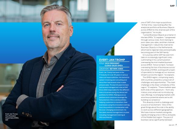 Evert-Jan Tromp has been in the IT Industry for over 30 years in various roles and responsibilities . He started his career in training and consulting and since then had several roles in sales and pre sales . The last 10 years he have had several management roles at SAP . Since 2015 responsible for the different lines of business along the whole SAP portfolio for EMEA . Making sure our partners and customers leverage the full potential of the overall portfolio . Helping customers to transform their businesses using the innovation coming from the portfolio in combination with the ever-changing environment . He has taken several management courses including management training at IMD and INSEAD . one of SAP ’ s first major acquisitions . “ At that time , I was looking after the analytical portfolio at Business Objects across EMEA for the channel part of the organisation ,” he recalls .