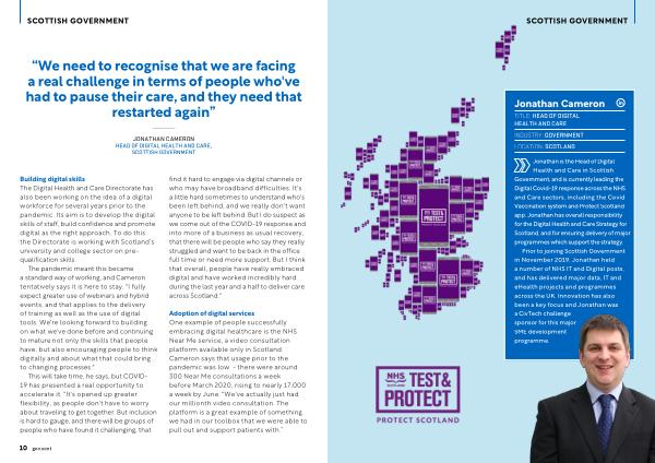 Health and Care in Scottish Government , and is currently leading the Digital Covid-19 response across the NHS and Care sectors , including the Covid Vaccination system and Protect Scotland app . Jonathan has overall responsibility for the Digital Health and Care Strategy for Scotland , and for ensuring delivery of major programmes which support the strategy .