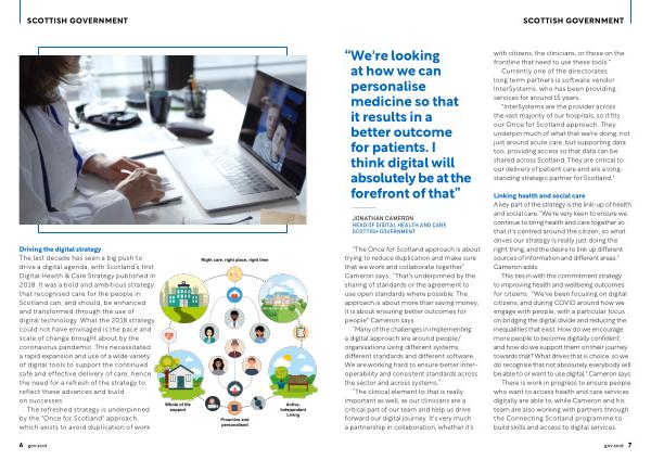 Driving the digital strategy The last decade has seen a big push to drive a digital agenda , with Scotland ’ s first Digital Health & Care Strategy published in 2018 . It was a bold and ambitious strategy that recognised care for the people in Scotland can , and should , be enhanced and transformed through the use of digital technology . What the 2018 strategy could not have envisaged is the pace and scale of change brought about by the coronavirus pandemic . This necessitated a rapid expansion and use of a wide variety of digital tools to support the continued safe and effective delivery of care , hence the need for a refresh of the strategy to reflect these advances and build on successes .