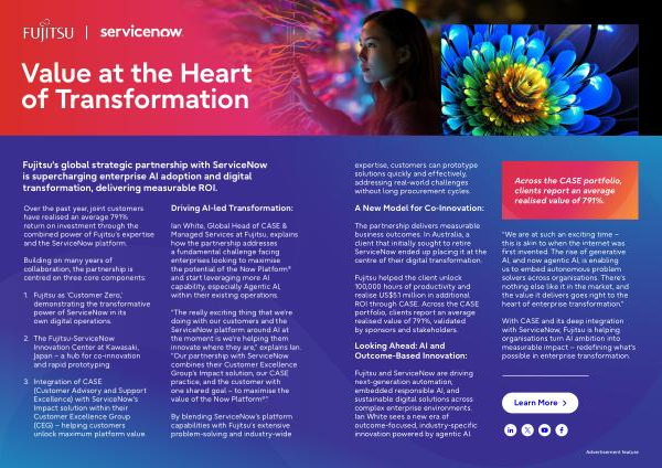 With CASE and its deep integration with ServiceNow, Fujitsu is helping organisations turn AI ambition into measurable impact – redefining what’ s possible in enterprise transformation.