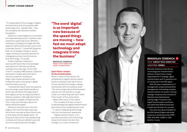 Branislav Zobenica is the Group Technology and Transformation Director at Sport Vision , being responsible for IT strategy , digital transformation and IT operations for 13 companies in the SEE region .