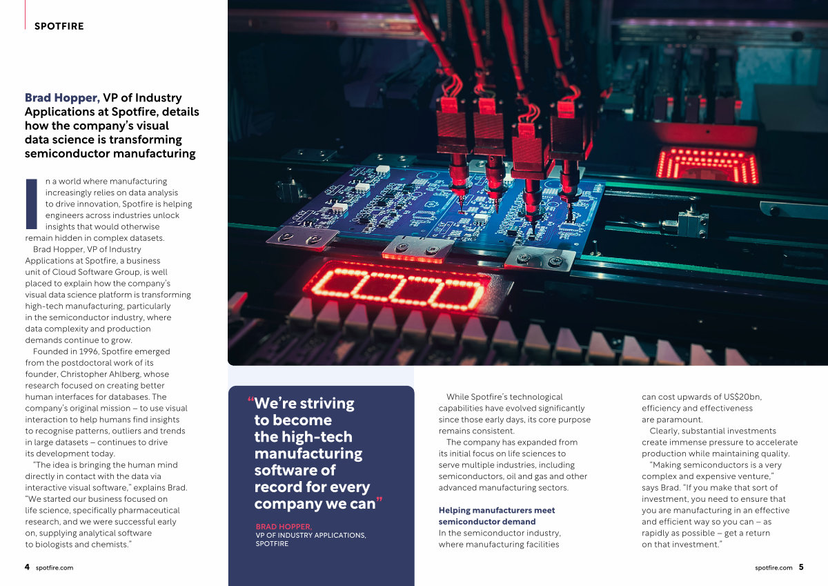 “ Making semiconductors is a very complex and expensive venture,” says Brad.“ If you make that sort of investment, you need to ensure that you are manufacturing in an effective and efficient way so you can – as rapidly as possible – get a return on that investment.” spotfire. com 5