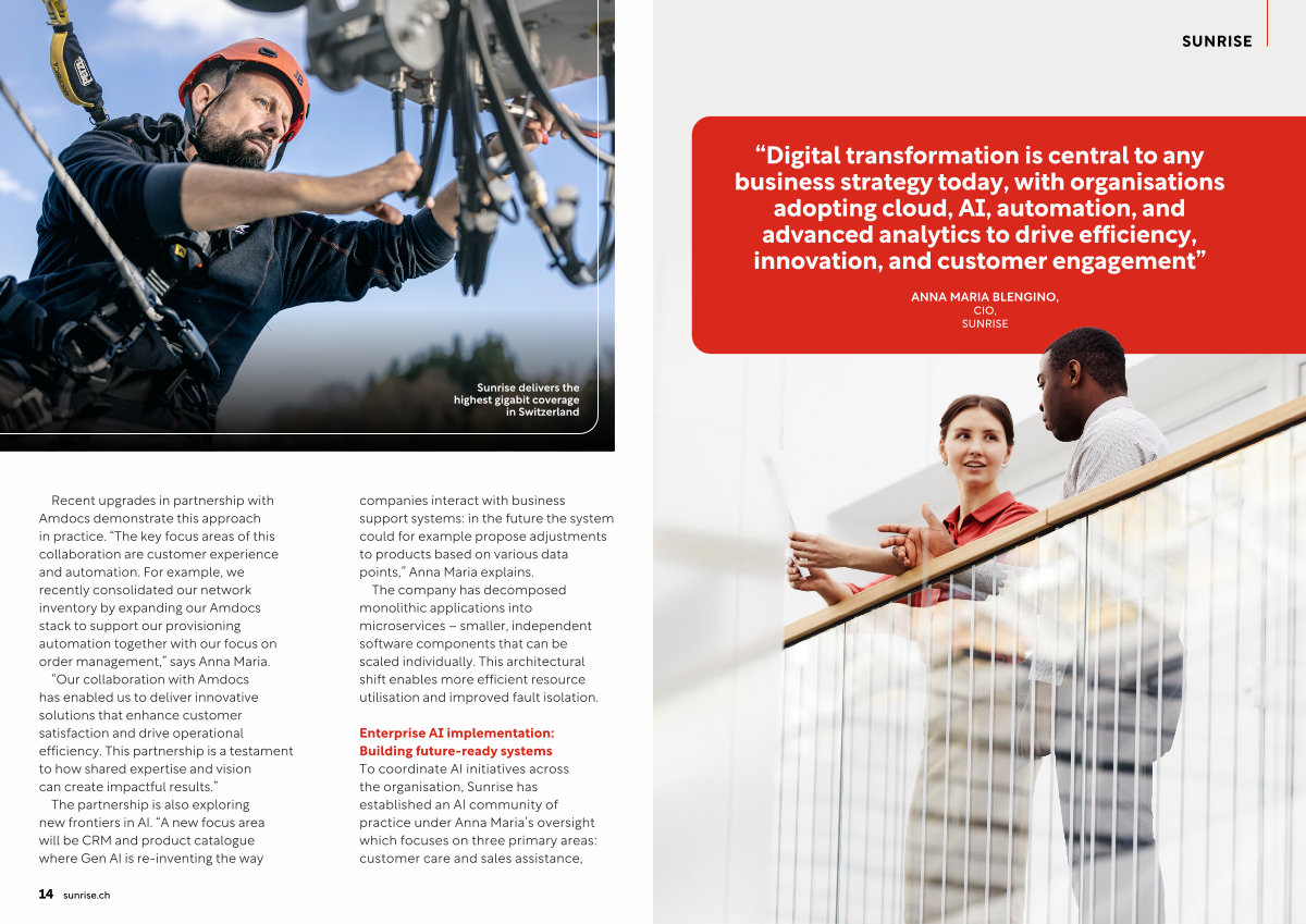 Enterprise AI implementation: Building future-ready systems To coordinate AI initiatives across the organisation, Sunrise has established an AI community of practice under Anna Maria’ s oversight which focuses on three primary areas: customer care and sales assistance,