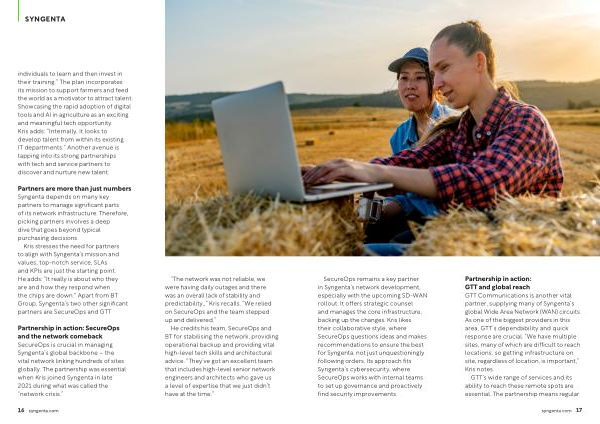 Kris stresses the need for partners to align with Syngenta’ s mission and values; top-notch service, SLAs and KPIs are just the starting point. He adds:“ It really is about who they are and how they respond when the chips are down.” Apart from BT Group, Syngenta’ s two other significant partners are SecureOps and GTT.