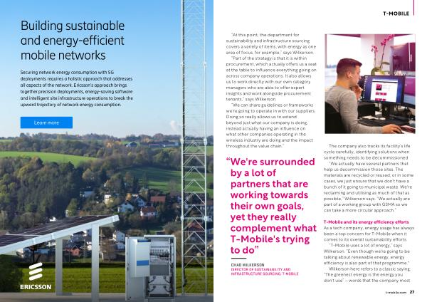 T-Mobile and its energy efficiency efforts As a tech company , energy usage has always been a top concern for T-Mobile when it comes to its overall sustainability efforts . “ T-Mobile uses a lot of energy ,” says Wilkerson . “ Even though we ' re going to be talking about renewable energy , energy efficiency is also part of that programme ."