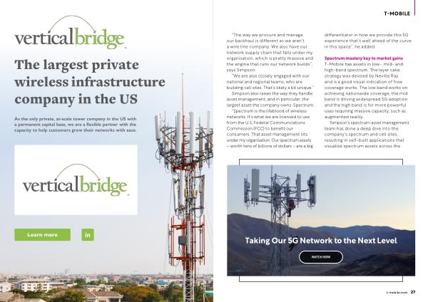 Spectrum mastery key to market gains T-Mobile has assets in low- , mid- and high-band spectrum . The layer cake strategy was devised by Neville Ray and is a good visual indication of how coverage works . The low band works on achieving nationwide coverage , the mid band is driving widespread 5G adoption and the high band is for more powerful uses requiring massive capacity , such as augmented reality .