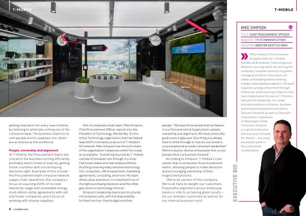 Mike Simpson ’ s Procurement & Supply team at T-Mobile handles all Enterprise , Technology and Network sourcing while also driving the company ’ s supplier diversity programs , managing its world-class spectrum assets , and leading award-winning energy sustainability programs . His team supports synergy attainment through enterprise-wide sourcing initiatives that have helped pave the way to T-Mobile ’ s national 5G leadership . His career includes positions in finance , business planning and operations with Nokia Siemens Network as well as Clearwire Corporation . A graduate of Washington State University , Simpson is a sports enthusiast who has even climbed Mt . Rainier – the most prominent peak in the continental United States .