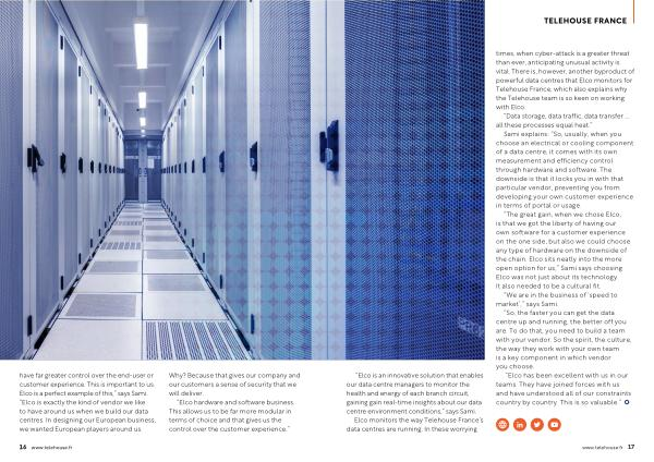 Elco monitors the way Telehouse France ’ s data centres are running . In these worrying times , when cyber-attack is a greater threat than ever , anticipating unusual activity is vital . There is , however , another byproduct of powerful data centres that Elco monitors for Telehouse France , which also explains why the Telehouse team is so keen on working with Elco .