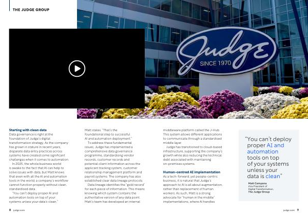 Human-centred AI implementation As a tech-forward, yet people-centric business, it is natural that Judge’ s approach to AI is all about augmentation, rather than replacement of human workers. As such, Matt is a strong advocate for“ human in the middle” implementations, where AI handles