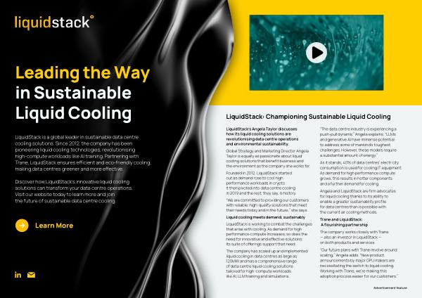 LiquidStack is a global leader in sustainable data centre cooling solutions . Since 2012 , the company has been pioneering liquid cooling technologies , revolutionising high-compute workloads like AI training . Partnering with Trane , LiquidStack ensures efficient and eco-friendly cooling , making data centres greener and more effective .