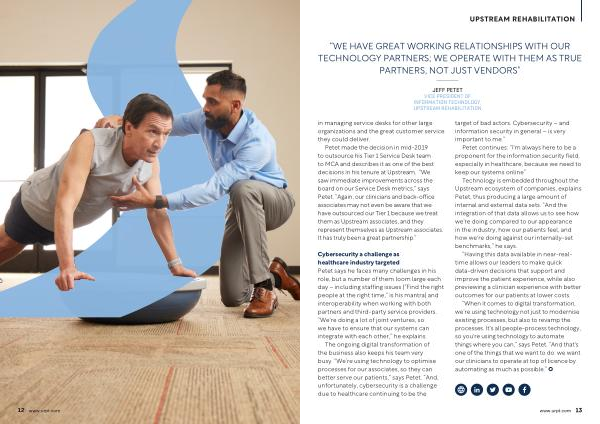 Petet made the decision in mid-2019 to outsource his Tier 1 Service Desk team to MCA and describes it as one of the best decisions in his tenure at Upstream . “ We saw immediate improvements across the board on our Service Desk metrics ,” says Petet . “ Again , our clinicians and back-office associates may not even be aware that we have outsourced our Tier 1 because we treat them as Upstream associates , and they represent themselves as Upstream associates . It has truly been a great partnership .”
