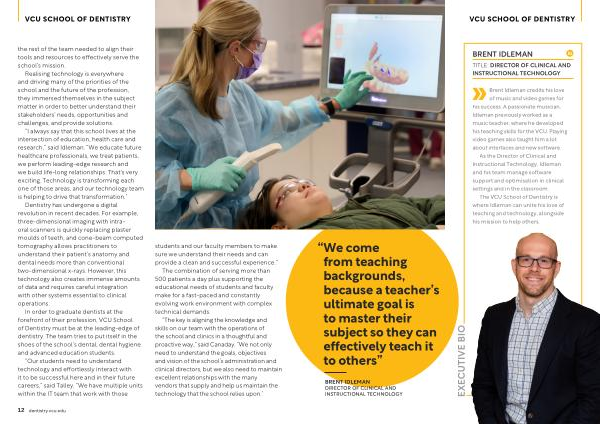 Brent Idleman credits his love of music and video games for his success . A passionate musician , Idleman previously worked as a music teacher , where he developed his teaching skills for the VCU . Playing video games also taught him a lot about interfaces and new software . As the Director of Clinical and Instructional Technology , Idleman and his team manage software support and optimisation in clinical settings and in the classroom .