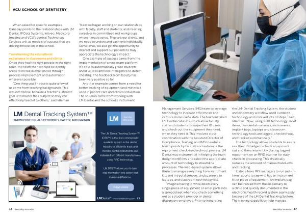“ Imagine having to write down every single piece of equipment or enter parts into a spreadsheet when you check something out as a student provider or dental dispensary employee . Prior to integrating the LM-Dental Tracking System , the student and dispensary workflow used outdated technology and involved lots of steps ,” said Idleman . “ Now , using RFID technology , most items , like dental materials , instruments , implant bags , laptops and classroom technology tools are tagged , checked-out , and tracked automatically .”
