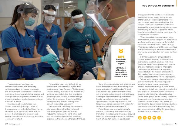 The disruption caused by the pandemic also ushered in another technological solution to patient relations . To help reduce the workload for front-office staff and improve the appointment reminder experience , the school partnered with Intiveo .