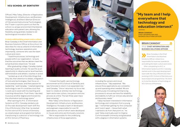 After completing his M . S . in Information Systems at VCU , Canaday started work in the web development team with the City of Richmond , then working at VCU School of Dentistry as a lead analyst and programmer . He went on to be the director of technology at VCU School of Pharmacy .