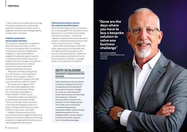 Keith Schlosser serves as an advisor to Vertesia, bringing over 36 years of experience across all facets of the insurance industry. He began his career as a field underwriter before transitioning into technology and operations, ultimately serving as CIO for several of the industry’ s most prestigious global firms. Keith’ s rare combination of underwriting expertise, operational insight, and technology leadership positions him as a strategic asset for carriers seeking to harness the power of agentic AI for competitive advantage.