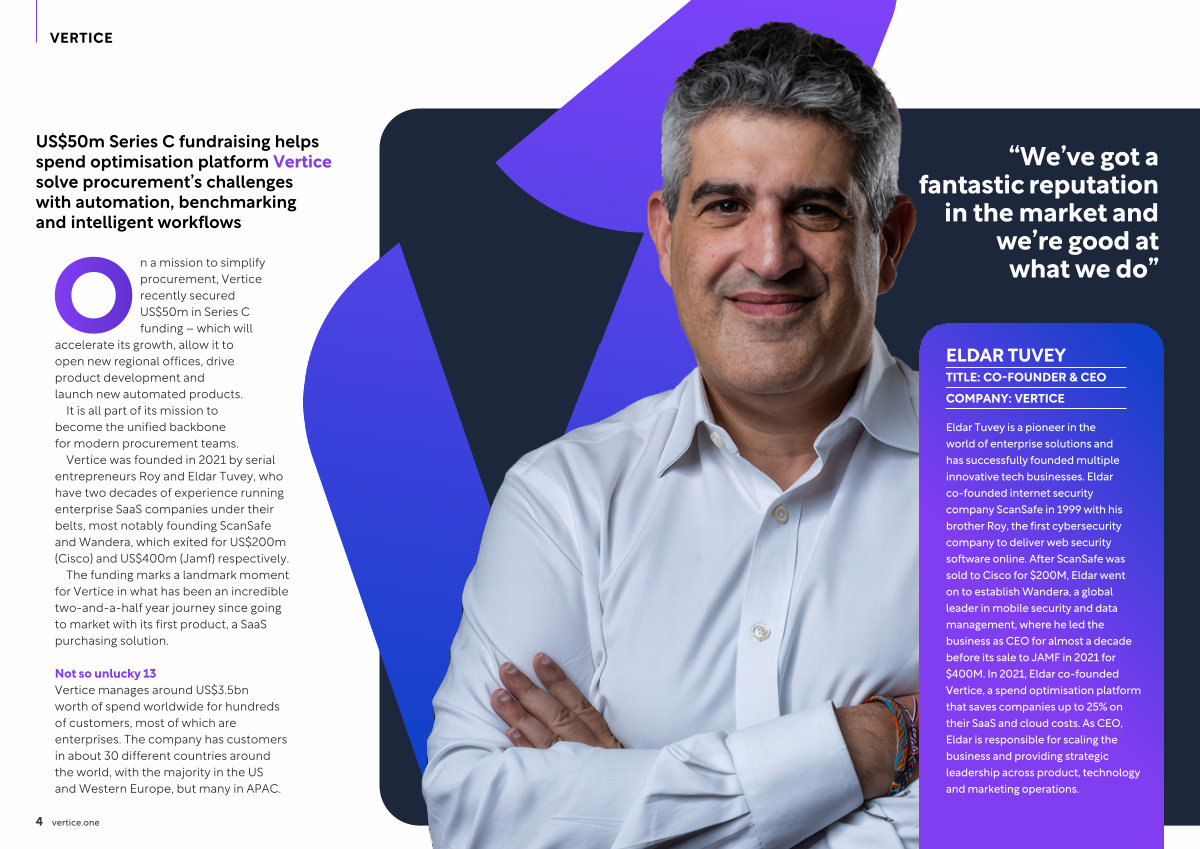 Eldar Tuvey is a pioneer in the world of enterprise solutions and has successfully founded multiple innovative tech businesses . Eldar co-founded internet security company ScanSafe in 1999 with his brother Roy , the first cybersecurity company to deliver web security software online . After ScanSafe was sold to Cisco for $ 200M , Eldar went on to establish Wandera , a global leader in mobile security and data management , where he led the business as CEO for almost a decade before its sale to JAMF in 2021 for $ 400M . In 2021 , Eldar co-founded Vertice , a spend optimisation platform that saves companies up to 25 % on their SaaS and cloud costs . As CEO , Eldar is responsible for scaling the business and providing strategic leadership across product , technology and marketing operations .