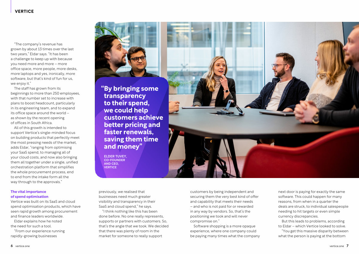 All of this growth is intended to support Vertice ’ s single-minded focus on building products that perfectly meet the most pressing needs of the market , adds Eldar , “ ranging from optimising your SaaS spend , to managing all of your cloud costs , and now also bringing them all together under a single , unified orchestration platform that simplifies the whole procurement process , end to end from the intake form all the way through to the approvals .”