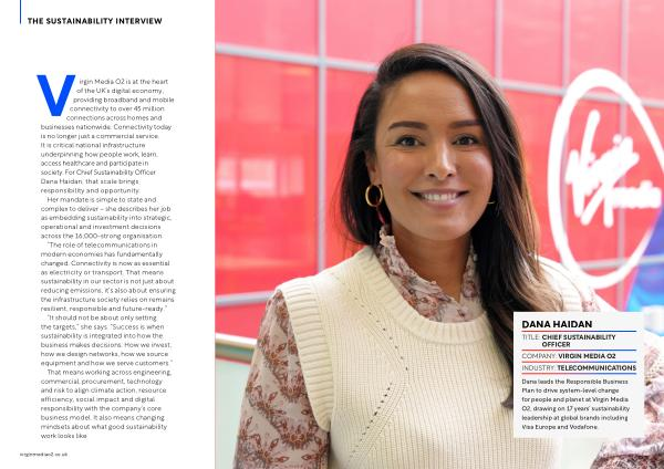 irgin Media O2 is at the heart of the UK’ s digital economy, providing broadband and mobile connectivity to over 45 million connections across homes and businesses nationwide. Connectivity today is no longer just a commercial service. It is critical national infrastructure underpinning how people work, learn, access healthcare and participate in society. For Chief Sustainability Officer Dana Haidan, that scale brings responsibility and opportunity.