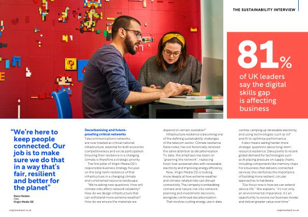 Decarbonising and futureproofing critical networks Telecommunications networks are now treated as critical national infrastructure, essential for both economic competitiveness and social participation. Ensuring their resilience in a changing climate is therefore a strategic priority. The first pillar of Virgin Media O2’ s responsible business strategy focuses on the long‐term resilience of that infrastructure in a changing climate and constrained resource landscape.