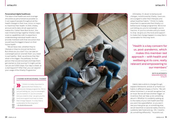 Personalised digital healthcare The idea is that healthcare and coverage should be as personalised as possible so it can support people throughout all the health changes in their lives , minor or major , to maximise their health . In 2021 , Vitality announced its data-driven approach to realise this . Called ‘ Next Best Action ’, the new initiative brings together Vitality ’ s data science capabilities with its expertise in understanding individual health risks to provide members with that one action that would have the biggest impact on their future health .