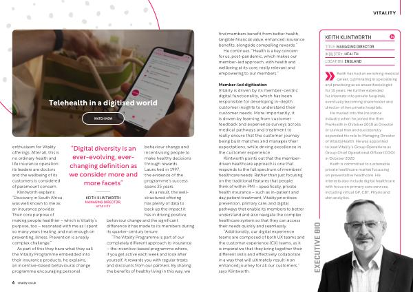 KEITH KLINTWORTH MANAGING DIRECTOR , VITALITY behaviour change and incentivising people to make healthy decisions through rewards . Launched in 1997 , the evidence of the programme ’ s success spans 25 years .