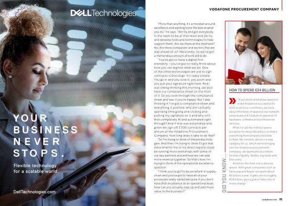“ You ' ve got to have a digital first mentality – you ' ve got to really think about how you can digitise what we do . One of the other technologies we use to sign contracts is DocuSign . It ' s really simple . You go in and you click it , you point and you put your signature right here . And I was sitting thinking this morning , we also have our compliance sheet on the front of it . So you look through the compliance sheet and see if you ' re happy . But I was thinking if I ' ve got a compliance sheet and everything is positive , why am I actually spending time going and clicking and putting my signature on it and why isn ' t that completely AI and automated right through ? And if that was automated and , given we sign off 3,500 contracts per annum at the Vodafone Procurement Company , how long does it take to do that ?