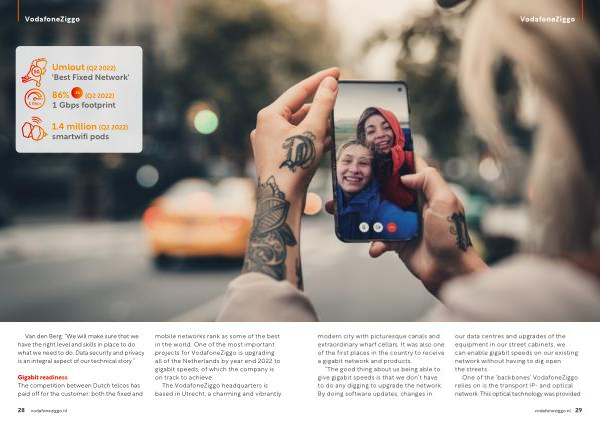 VodafoneZiggo modern city with picturesque canals and extraordinary wharf cellars . It was also one of the first places in the country to receive a gigabit network and products .