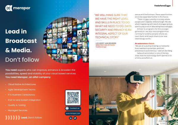 An autonomous future “ We are on a journey to bring our networks from reactive to proactive , and from preventive to autonomous ,” said van den Berg . Network automation is one of the key areas that the technology team spends a lot of time and effort on . vodafoneziggo . nl 37