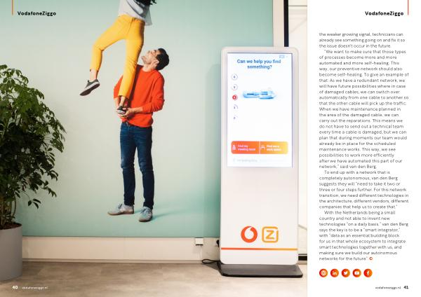 With the Netherlands being a small country and not able to invent new technologies “ on a daily basis ,” van den Berg says the key is to be a “ smart integrator ,” with “ data as an essential building block for us in that whole ecosystem to integrate smart technologies together with us , and making sure we build our autonomous networks for the future ”. vodafoneziggo . nl 41