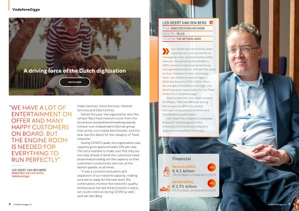 Leo-Geert has over twenty years experience in various technical managerial roles , predominantly within telecom . He joined Liberty Global in 2001 where he held several technical management positions , the last few years as Vice-President in the Technology team . Leo-Geert moved to Ziggo in 2014 and became CTO in 2016 . After the merger of Vodafone and Ziggo Leo- Geert has been responsible for the Fixed networks in VodafoneZiggo .