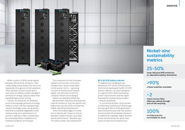 BC 2 AI UPS battery cabinet To address the changing power behaviour of AI-driven infrastructure, ZincFive has developed the BC 2 AI UPS battery cabinet, a product designed to support both traditional backup power requirements and the rapid fluctuations introduced by modern compute workloads.