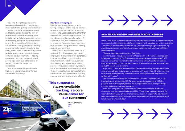 Snowflake ’ s experience demonstrates Zip ’ s ability to manage large-scale spend . Zip provided visibility into over US $ 6.7bn of spend and logged savings of over US $ 300m for the company . “ Those are very significant metrics .” Rujul adds . Another success story Zip is proud of is Discover , one of the world ’ s leading digital banking services . Prior to Zip , Discover ’ s procurement process involved over 3,000 requests annually across more than 20 teams , coordinating five different systems . After implementing Zip , the company saw a 67 % increase in procurement throughput and a 14 % reduction in cycle time .